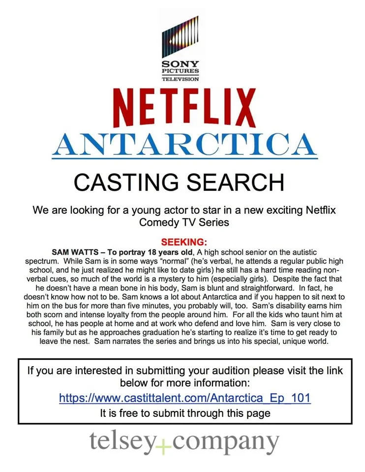 Sony Pictures and Netflix are holding a nationwide talent search for the role of Sam Watts, an 18 year old character who stars in their upcoming comedy “Antarctica.” The production is searching for a teen, male actor who appears to be around 18 years old to fill the starring role.
