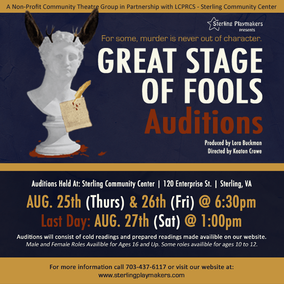 Sterling Playmakers is holding open auditions for “Great Stage of Fools,” a modern satirical murder mystery featuring many of Shakespeare’s famous characters by K. Crowe and E.M. Paquette.