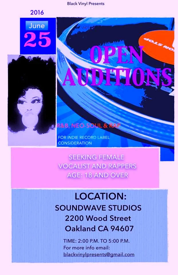 Open audition call for female vocalist and female rappers. Saturday – June 25, 2016 2:00 p.m. – 5:00 p.m. at Soundwave Studios, 2200 Wood St., Oakland, Ca. 94607 Accepting R&B, Neo Soul, Funk & Hip Hop Vocalist. All that’s required is you and your voice. ages 18 & over
