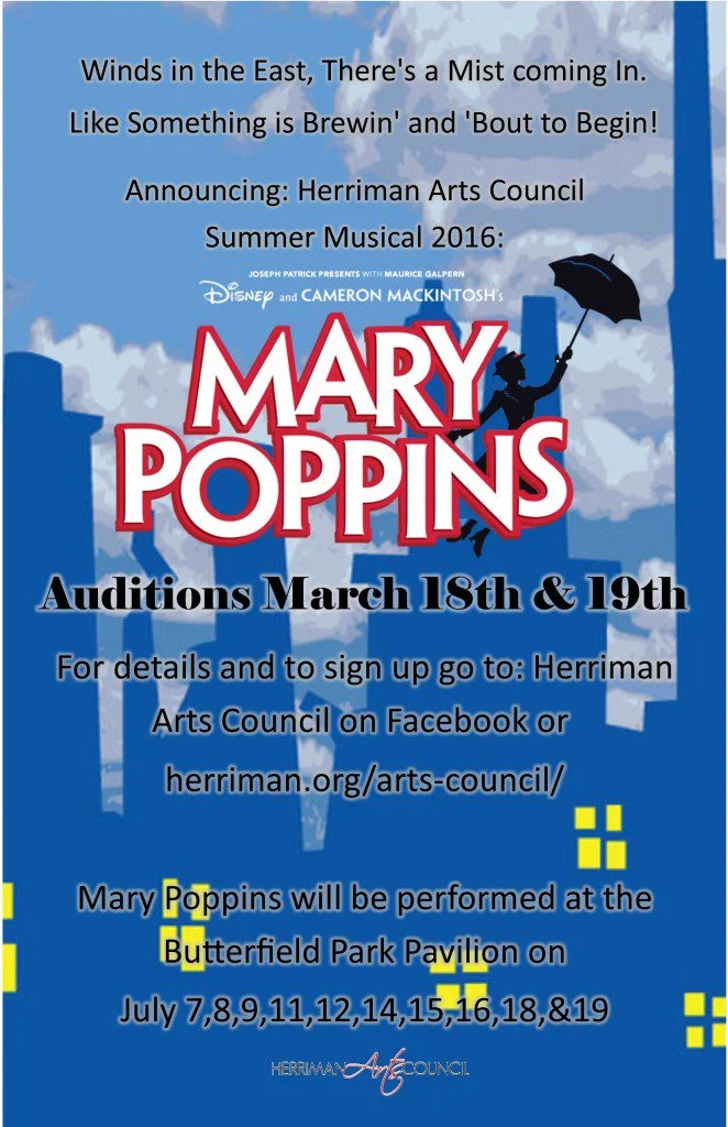 The Herriman Arts Council (HAC) is thrilled to announce our 2016 summer Broadway musical production of “Mary Poppins”. Auditions will be held on Friday, March 18 from 7-9pm and Saturday, March 19th from 8am to 1:00pm at the Herriman City Hall, 13011 S. Pioneer St. Herriman, UT. All roles are open but you must be at least 14 years old at the time of audition to audition for these roles. To register for an audition time, please visit: https://events.regtix.com/herrimanarts.htm