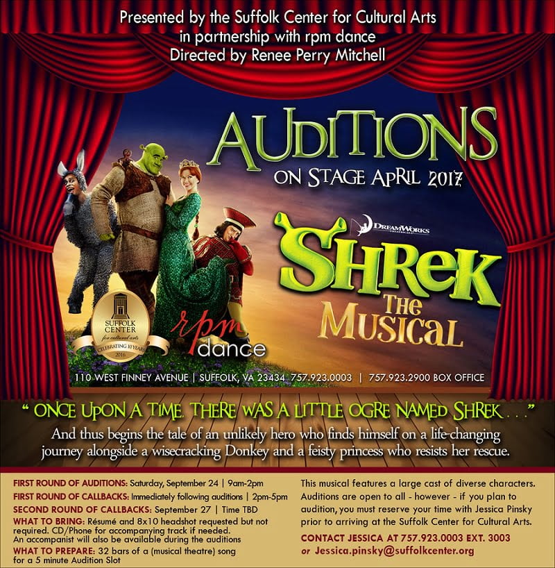 Auditions are open to the public, but APPOINTMENTS ARE REQUIRED. Please contact Jessica Pinsky, Program Coordinator, to schedule your audition. Go to http://www.suffolkcenter.org/shrek-the-musical-audition-notice/
