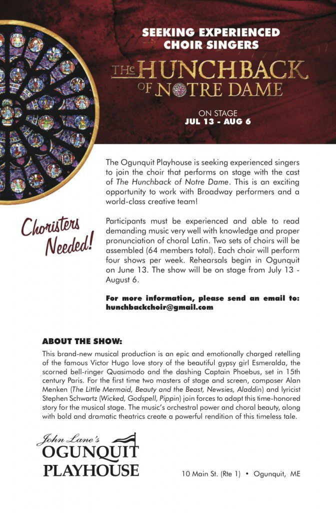 The Ogunquit Playhouse is seeking experienced singers to join the choir that performs on stage with the cast of The Hunchback of Notre Dame. This is an exciting opportunity to work with Broadway performers and a world-class creative team!