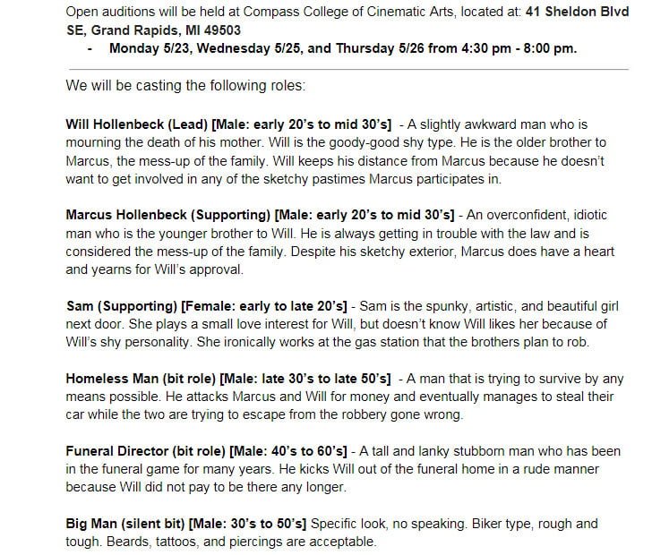 Casting Call for “Long Night”, a short comedy! Auditions are taking place May 23rd, 25th, and 26th at Compass college of Cinematic Arts (41 Sheldon Blvd SE, Grand Rapids, MI 49503). All roles are unpaid, but talent will be fed on set. Serious, non-union applicants only please!