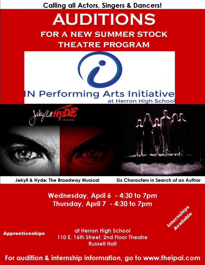 Indiana Performing Arts Initiative looking for specific male and female actor/singers, from local area high schools, colleges, and the adult community for two productions this summer: Jekyll & Hyde: The Musical, and Six Characters in Search of an Author. For specified roles, and audition information, including what to prepare, location, times, dates, etc., go to www.theipai.com