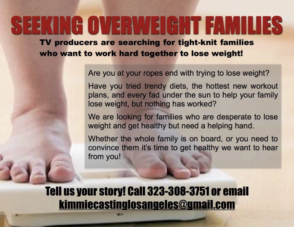 TV producers are searching for tight-knit families who want to work hard together to lose weight! We’re not just looking for families who need to loose 25 pounds, we are searching for families who are 400 pounds plus and need to lose the weight for health reasons. Have you tried family diets, the hottest new workout plans, and the trendiest superfoods, but nothing has worked?