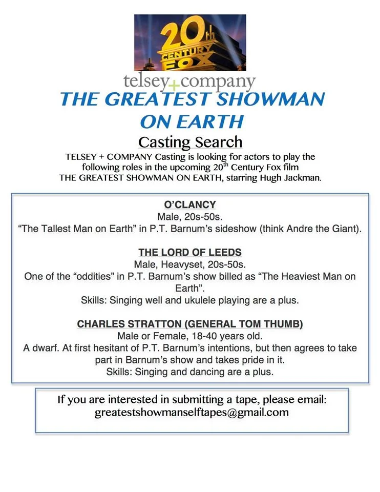 The movie covers showman P.T. Barnum as he creates Barnum and Bailey Circus in 1881. The roles up for grabs are those of circus performers, specifically, O’Clancy, the tallest man on Earth, General Tom Thumb and The Lord of Leeds. Casting directors with Telsey and Company are now accepting self taped auditions from actors that fit the descriptions which are listed below.