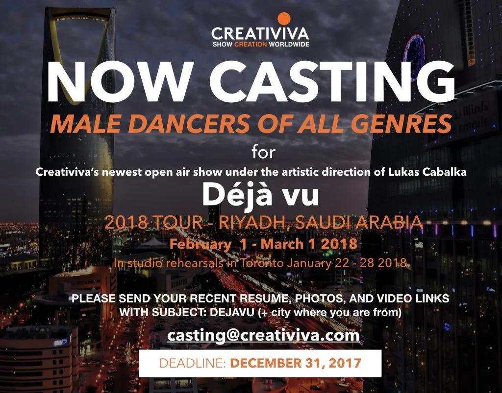 Creativiva is now casting MALE DANCERS from Canada and the USA to join us for our tour in Riyadh, Saudi Arabia! This will be a one month tour for a dance performance at a family friendly festival.