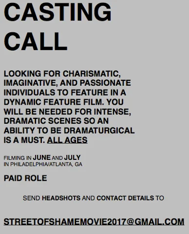 In need of leads, supporting roles, and extras for a feature film taking place in Philadelphia. Film called Street of Shame, a story based on addiction and the struggles on trying to get better, but never succeeding.