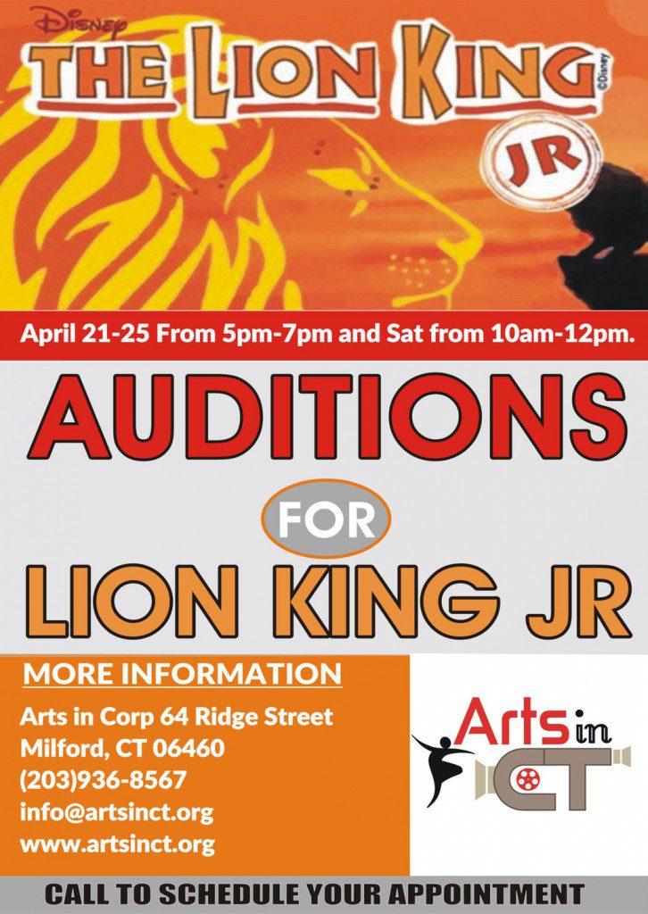 Lion King Jr Auditions will be held on April 21-28 with callbacks on Saturday April 29th, has been extended from 5 pm-7 pm.