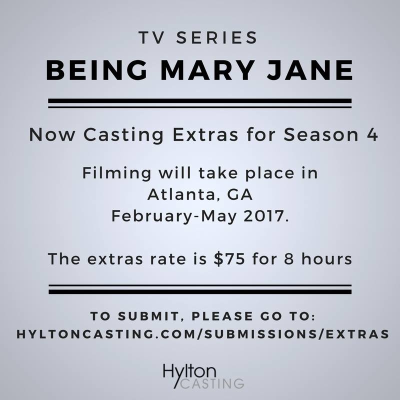 The television series “Being Mary Jane” is now casting extras for Season 4! Filming will take place in Atlanta, GA from February-May, 2017. The extras rate is $75/8 hours, with an 8 hour guarantee and overtime after 8 hours.