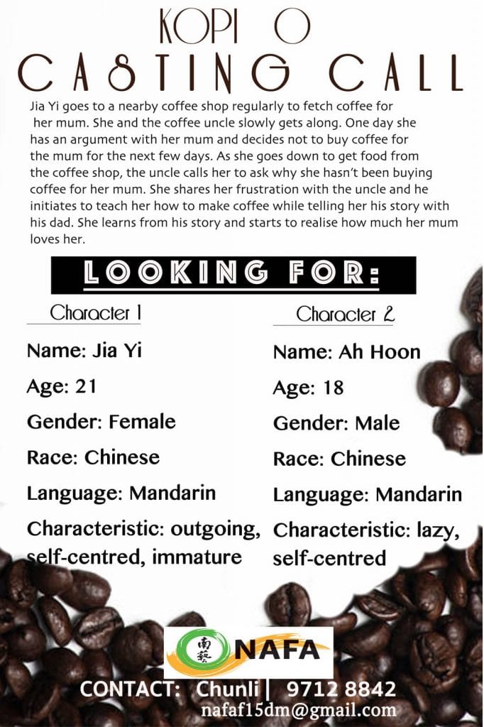 Hi we are a group of year 3 NAFA students looking to cast the two roles, Jia Yi and Ah Hoon.