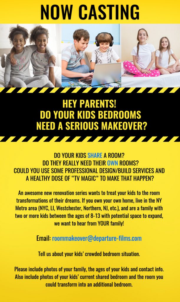 A new home show would love a chance to treat your kids to a bedroom of their dreams. The show is currently casting families that live in the New York City metropolitan area which includes NYC, Westchester and Northern New Jersey. The show would love to hear from families that have 2 or more kids that are between the ages of 8 and 13. The home show is especially interested in homeowners that have room to expand and build.