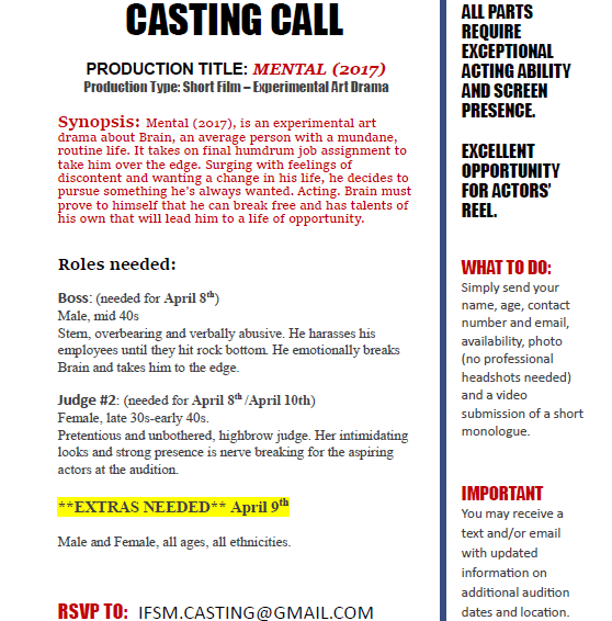 RSVP TO: IFSM.CASTING@GMAIL.COM