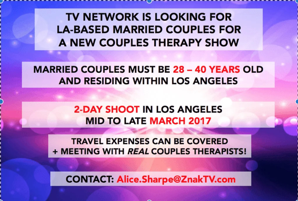 This casting notice was posted by: MARRIED COUPLES NEEDED FOR THERAPY SHOW