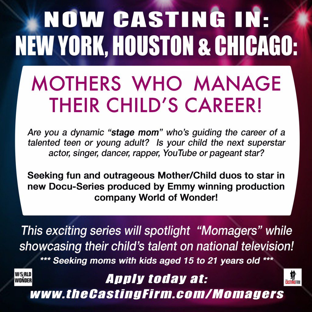 NOW CASTING IN NEW YORK, HOUSTON & CHICAGO: Mothers who manage their child’s career.