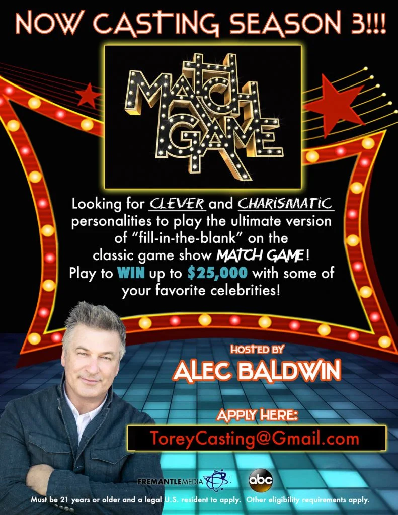 We’re auditioning in the area and are now accepting submissions for “MATCH GAME,” hosted by Alec Baldwin!