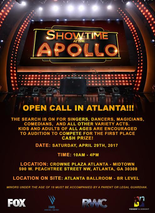 On behalf of Venertainment for FOX’s “Showtime at the Apollo,” I am pre-booking talent to audition on Saturday, April 29th.