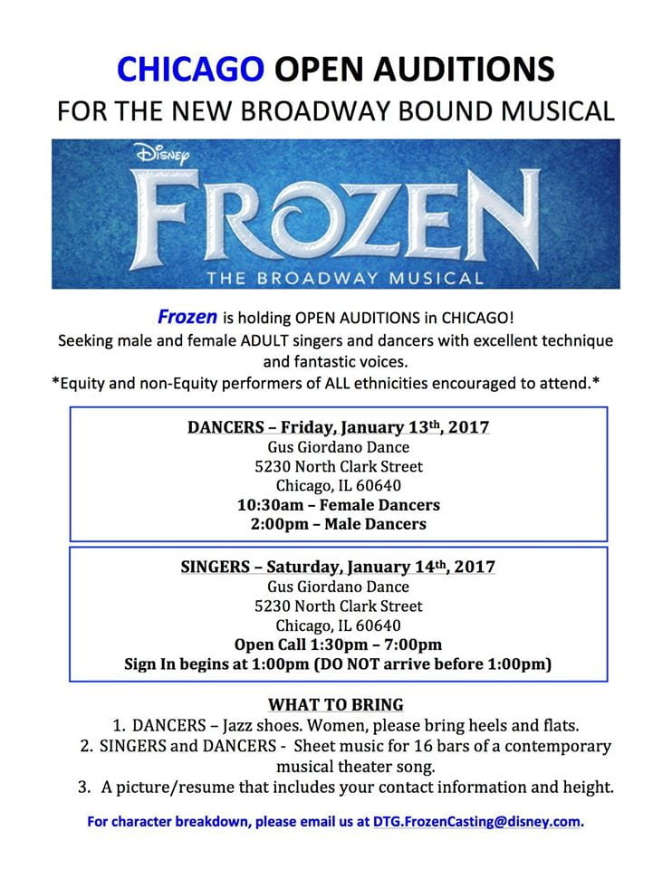 The popular Disney movie “Frozen” is coming to the Broadway stage and is looking for talented dancers who can also sing to join the Broadway show.