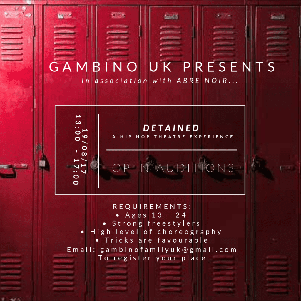 “Detained” is an interactive hip hop theatre production from Gambino UK. This show tells the story of one hour in an after school detention. We follow 7 individuals of different ages, as the audience gets an insight into all of their personal lives learning how they are all connected in one way shape or form.