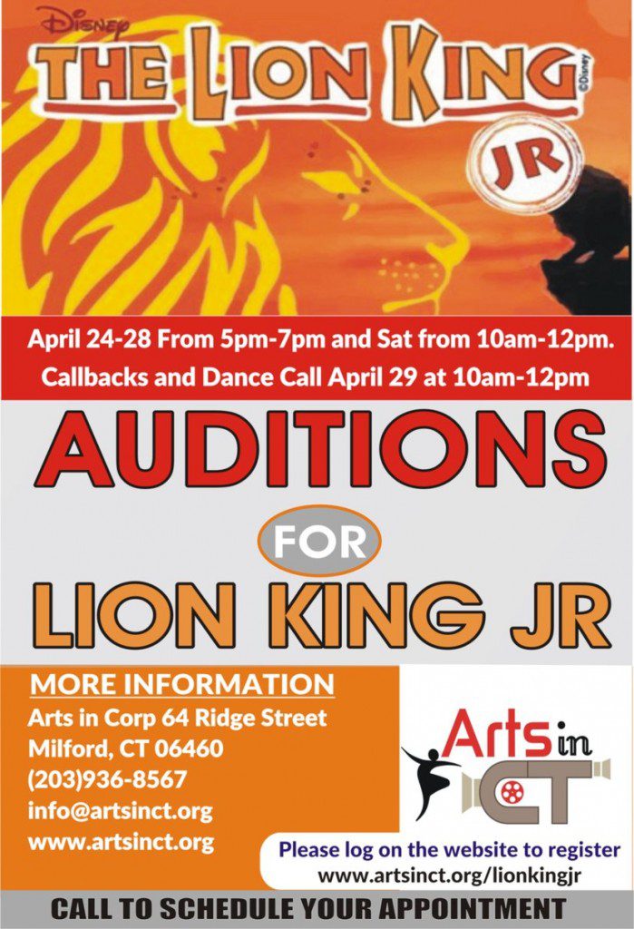 Auditions for Lion King Jr will be held on April 21-28 from 5pm-7pm and callbacks on the 29th. Rehearsals will begin on May 2-June 23 and the performance will be on June 24th. All roles are open.