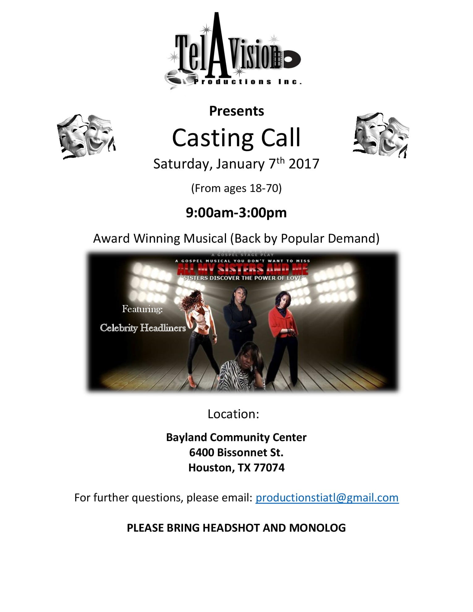 Tel A Vision Productions,” features (AWARD WINNING MUSICAL) an Inspirational Stage Musical, “All My Sisters and Me,” in Houston TX April 2nd, 2017. Project will feature major Headliners. Currently we are casting actors/actresses & vocalist for the production, of all ethnic and genders; experience preferred, but are taking inexperience actors/actresses. Pays $250 per show.
