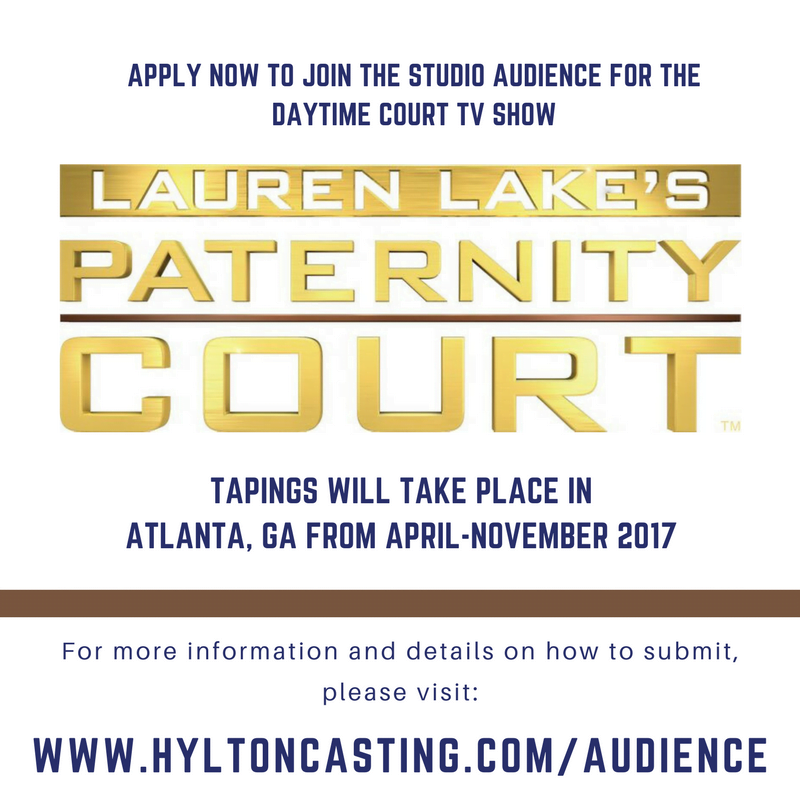 Be a STUDIO AUDIENCE MEMBER on the TV show LAUREN LAKE’S PATERNITY COURT taping in Atlanta, GA April-November, 2017!