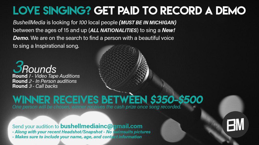 Want to get paid to sing a Demo? Bushellmedia is looking for people between the ages of 15 and up to sing a new Demo. We are on the search to find a person with a beautiful voice to sing a Inspirational song.