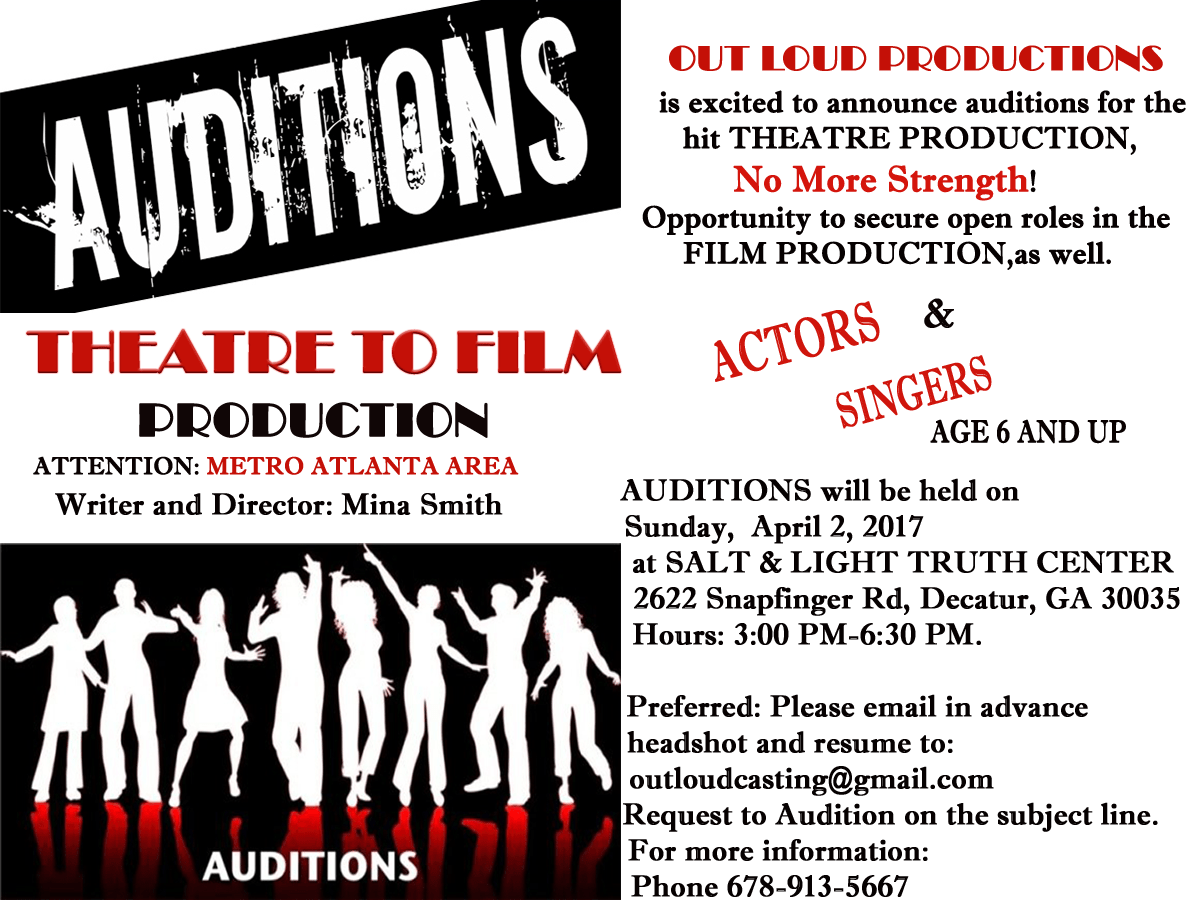 OUTLOUD PRODUCTIONS THEATRE COMPANY is excited to announce auditions for their hit theatre production, No More Strength, with the opportunity to secure a role in the SCREENPLAY, as well. We are seeking talent for actors from age six and up, in addition to some singing roles available. Actual performance, filming dates and show times are TBA. Rehearsals are to begin in April 2017.