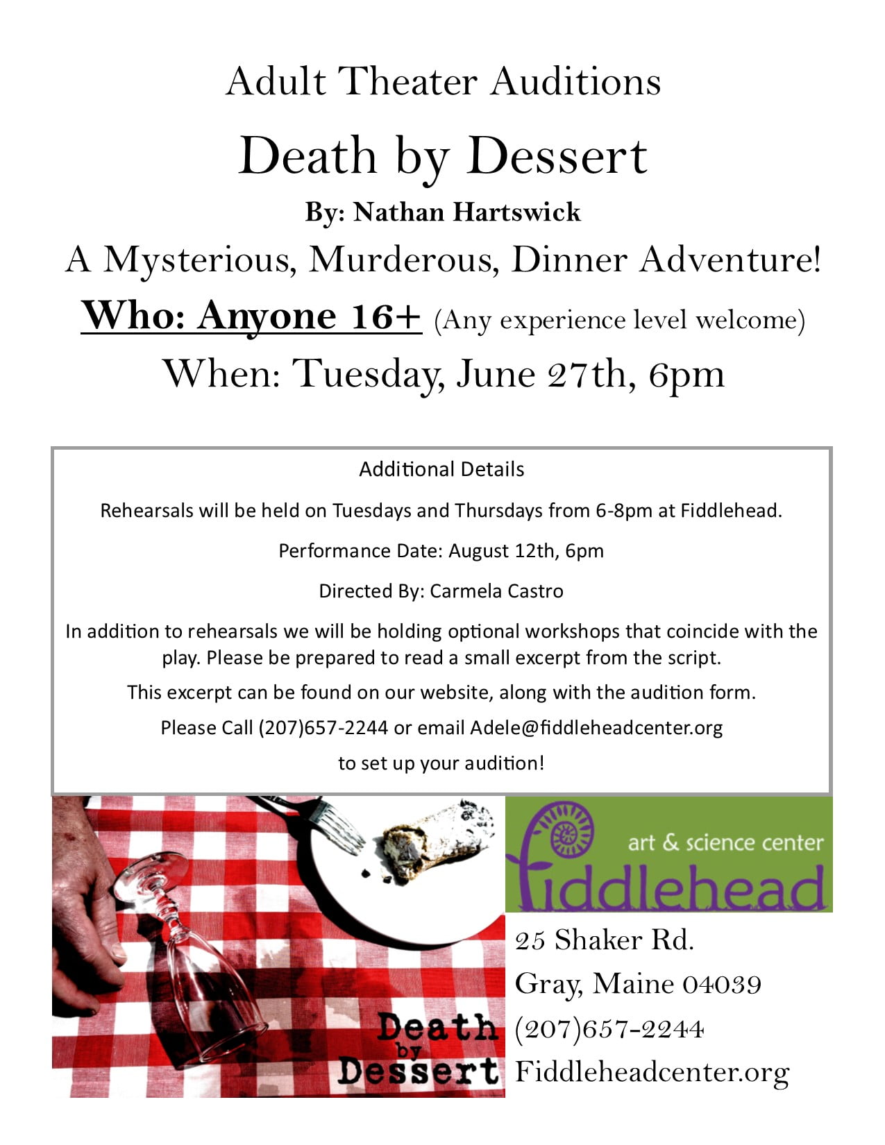 Casting for ages 16+. Fiddlehead Center is putting on it’s first mystery dinner theater production of ‘Death by Dessert.’