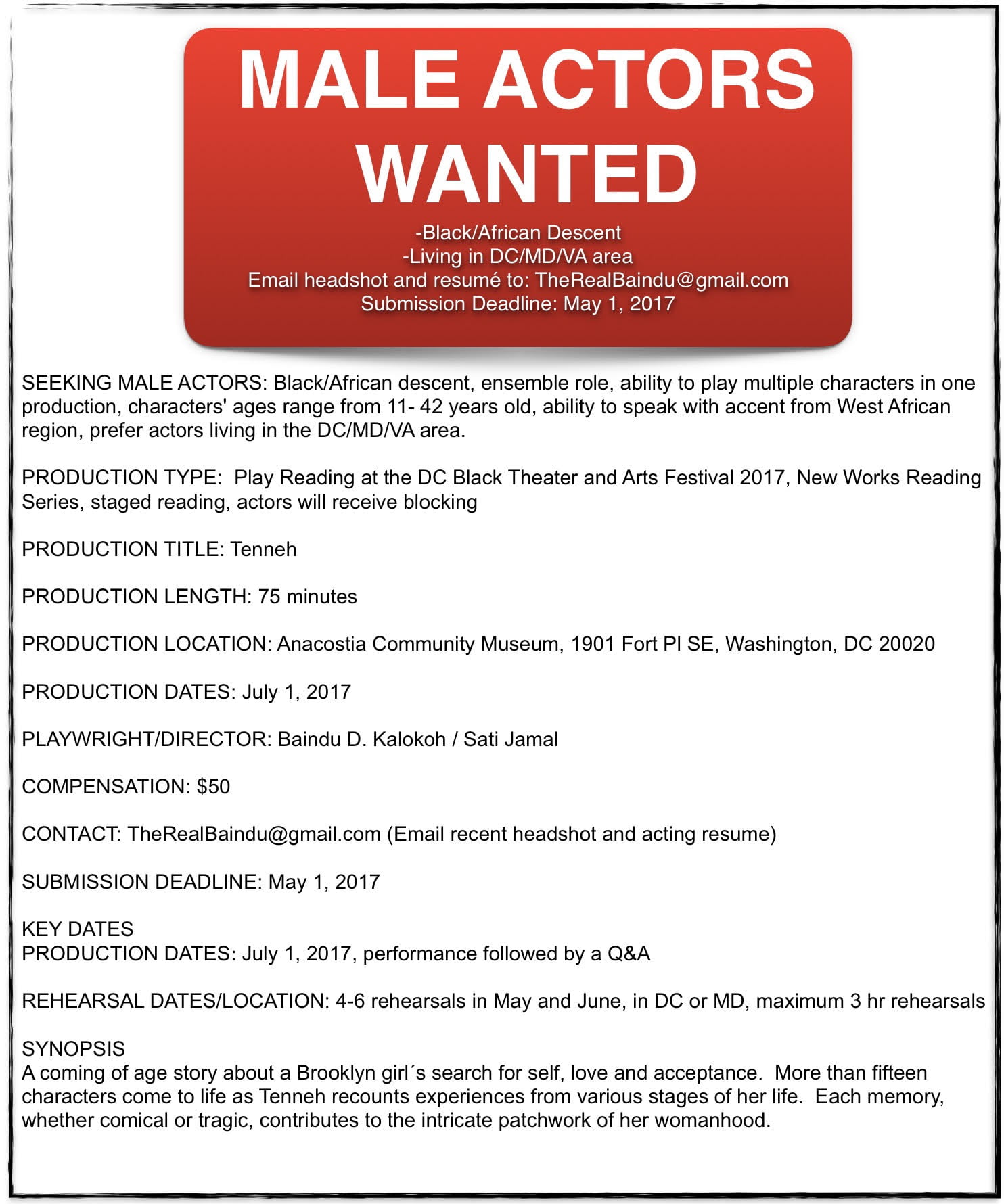 SEEKING MALE ACTORS: Black/African descent, ensemble roles, ability to play age ranges 11-42 and play multiple characters in one production, should live in the DC/MD/VA area.