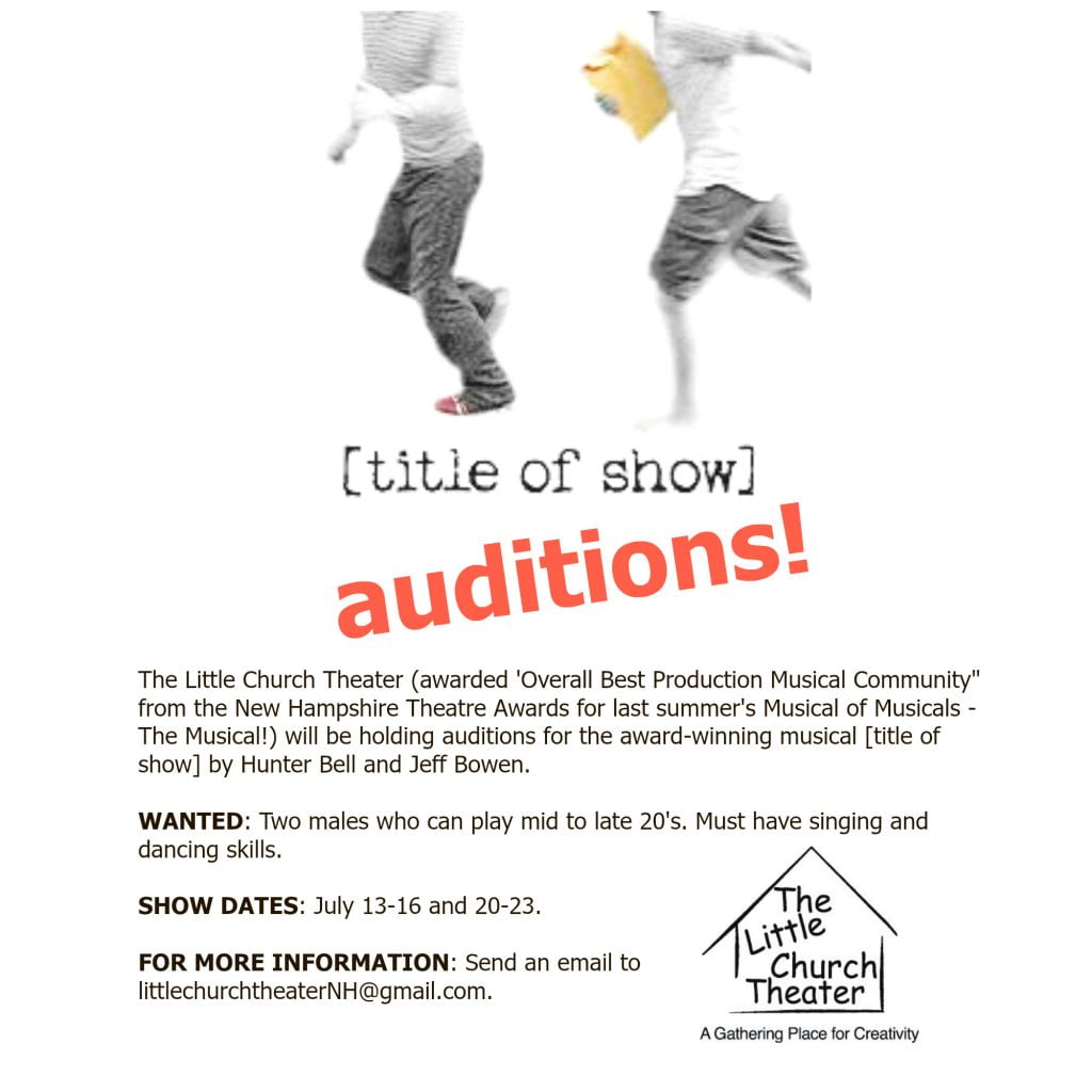 Little Church Theater is currently looking for submissions for its summer production of [title of show] on stage July 13-16 & 20-23. Please contact littlechurchtheaterNH@gmail.com to schedule an audition or to submit a video.
