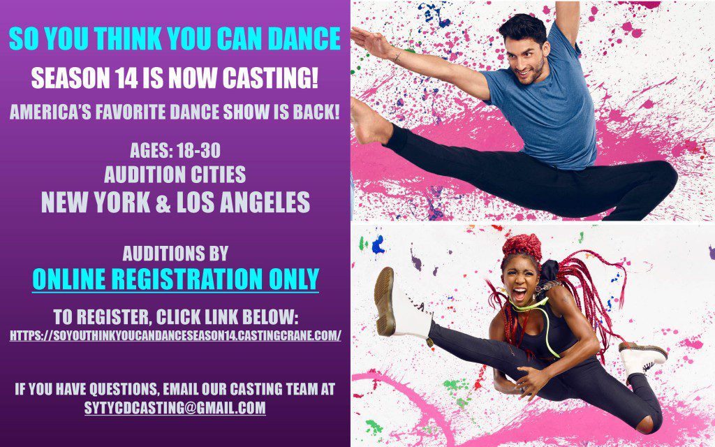 soyouthinkyoucandanceseason14.castingcrane.com and upload a video or provide a link to a video of their performance. If selected, producers will reach out to schedule the contestant for an in-person audition in Los Angeles (March 17-19).
