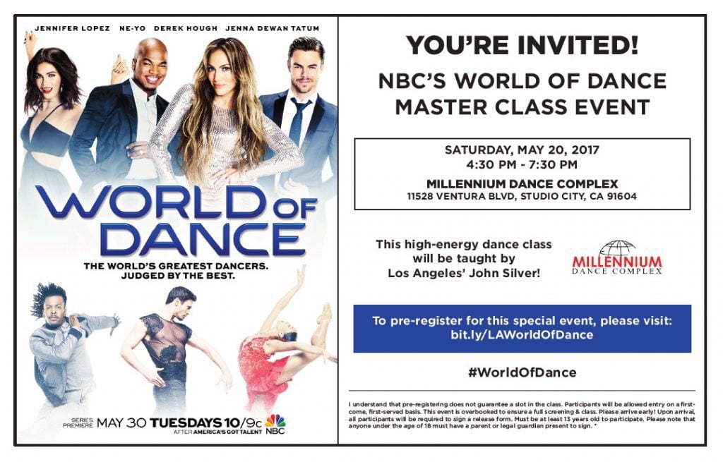Join us at Millennium Dance Complex in Studio City at 4:30pm on Saturday, May 20th for a free master class from John Silver! Attendees will get a sneak peek at the first episode of a major upcoming dance competition show and learn a fully choreographed routine for a full song. Attending is free! Reply to this posting to register! Dancers of all styles and experience levels wanted, attendance is FREE.