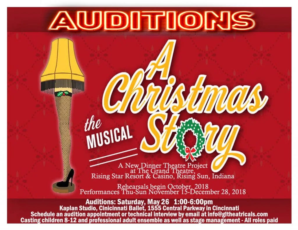 Ghostlight Theatricals in association with Rising Star Resort & Casino in Rising Sun, Indiana will hold auditions for “A Christmas Story: The Musical” on Saturday, May 26 from 1-6pm in the Kaplan Studio at Cincinnati Ballet, 1555 Central Parkway in Cincinnati. To schedule an audition, actors should email info@gltheatricals.com and request an appointment. Video submissions will also be accepted prior to May 26 at that same email address.