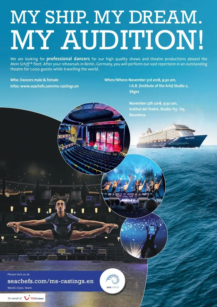 We are looking for professional dancers for our high quality shows and theater productions aboard the Mein Schiff fleet. While traveling the world you will perform our vast repertoire in an outstanding theater for over 1.000 guests.