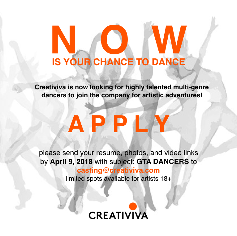 Creativiva is now looking for highly talented multi-genre dancers to join the company for artistic adventures! Please send your resume, photos, and video links by April 9, 2018 with subject GTA Dancers to casting@creativiva.com. Limited spots available for artists 18+.
