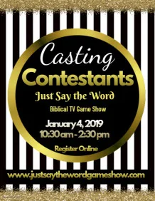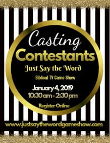 Call for Contestants for Just Say the Word Biblical Game Show weekly on Saturdays at 12 pm noon CST premiering on December 8. We are currently seeking Contestants 10 years and older to play for Prizes.