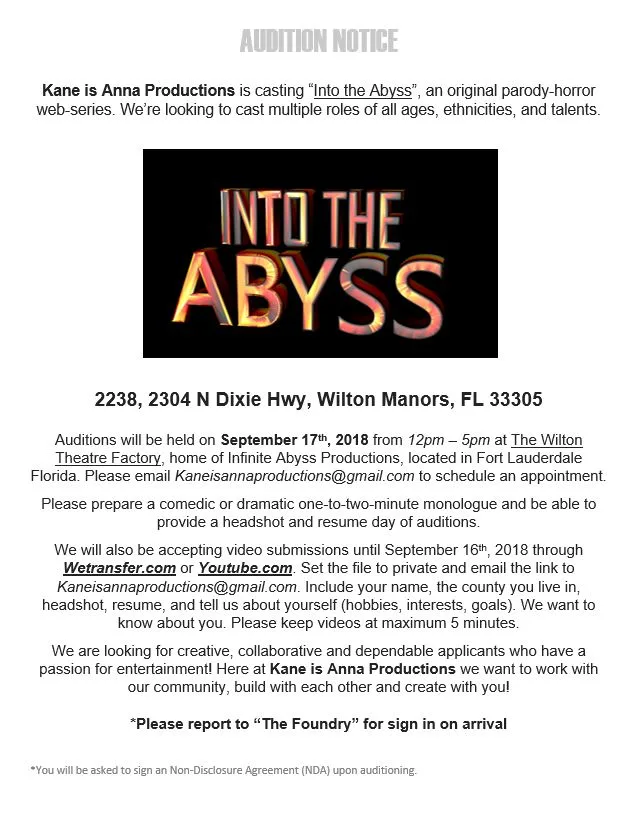 Auditions will be held on September 17th, 2018 from 12pm – 5pm at The Wilton Theatre Factory, home of Infinite Abyss Productions, located in Fort Lauderdale Florida. Please email Kaneisannaproductions@gmail.com to schedule an appointment.
