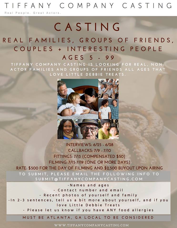 Little Debbie Snack Cakes, shooting here in Atlanta. We are casting REAL PEOPLE (non actors) of all shapes and sizes, ages and ethnicities. For this commercial we are seeking real families, real groups of friends, real bus drivers, real bakery workers, real cowboys (especially Sam Elliott lookalikes), and real fly fishermen and their sons.