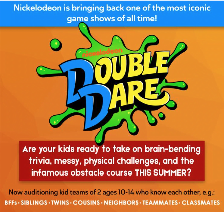 Nickelodeon’s Double Dare is now casting online and parents are able to submit their kids to the show by using the online casting forms created by the show’s casting directors.