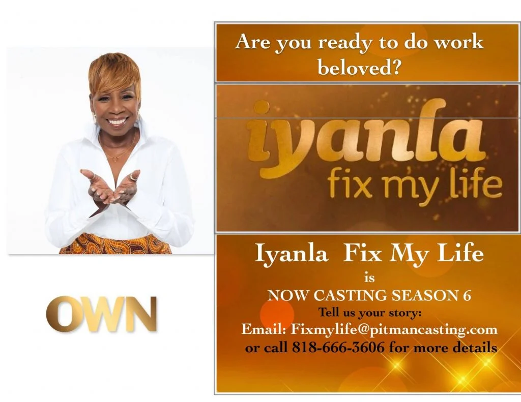 Iyanla Vanzant is now casting for season 6 of her inspirational show that airs on the Oprah Winfrey Network. Iyanla is an accomplished author and inspirational speaker who tries to help others improve their lives. She uses her past, in which she had to overcome obstacles and personal struggles to become stronger, in order to help others improve their futures.