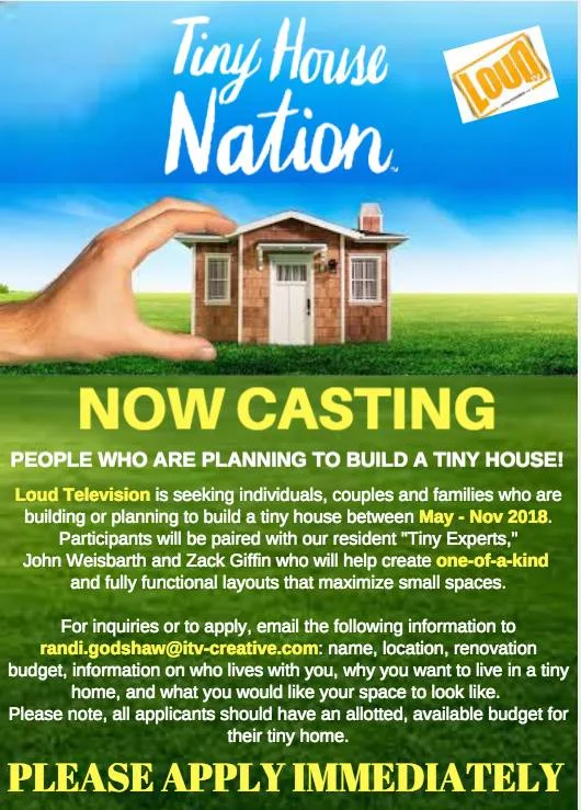 Producers at Loud TV are looking for people and couples who are in fact planning to build a tiny house sometime between May and November 2018. Those cast for the show will be paired with the show’s Tiny House experts (John Weisbarth & Zack Giffin). Those experts may help you create a one of a kind, tiny home, that will maximize the small space and offer up the functionality to make the tiny space work.