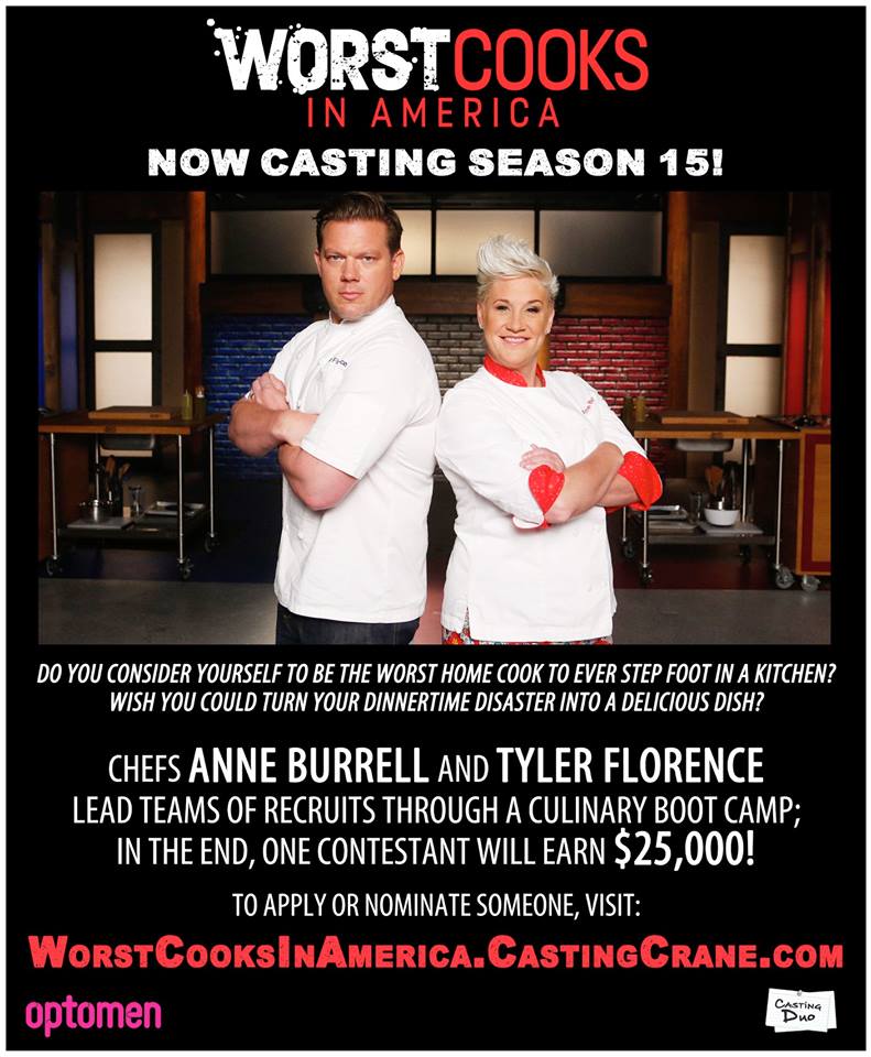 Have you always dreamt of being able to cook elaborate meals for your family and friends? Worst Cooks in America is back and casting NATIONWIDE for season 15! If you think YOU are the worst cook in America, apply now at WorstCooksInAmerica.castin