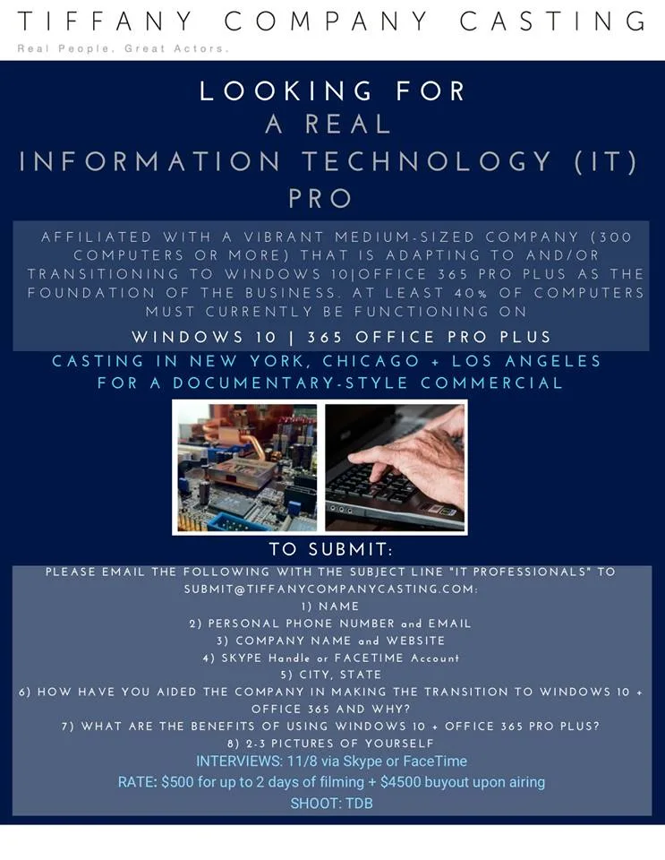 Tiffany Company Casting is casting an amazing commercial for a major tech brand looking for Real IT (Information Technology) Pro affiliated with a vibrant medium- sized company (with at least 300 computers) that is adapting and/ or transitioning to Windows 10 and Office 365 PRO PLUS as the foundation of the business. At least 40% of computers must currently be running on Windows 10 + Office 365 PRO PLUS.