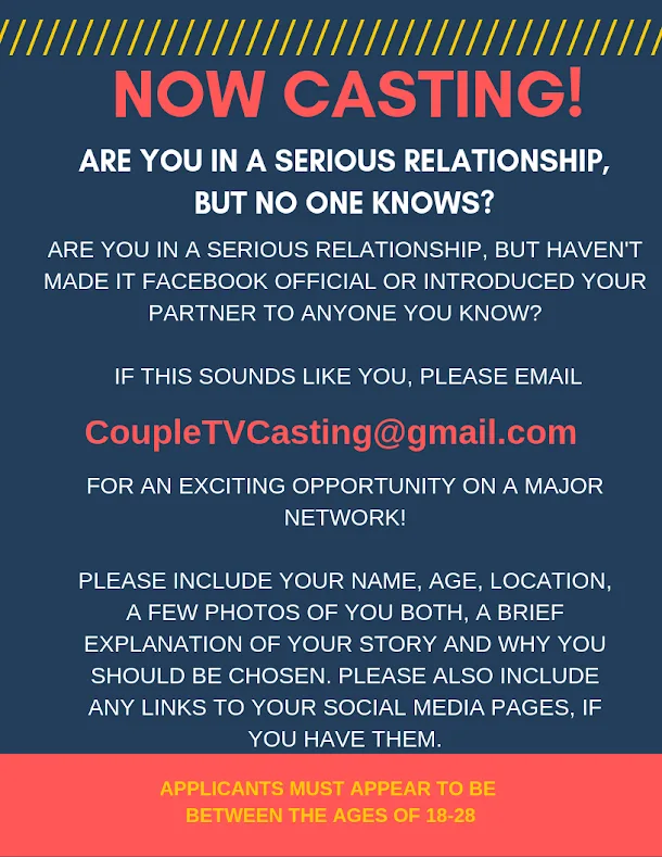If this sounds like you, please email coupleTVcasting@gmail.com for an exciting opportunity on a major network!