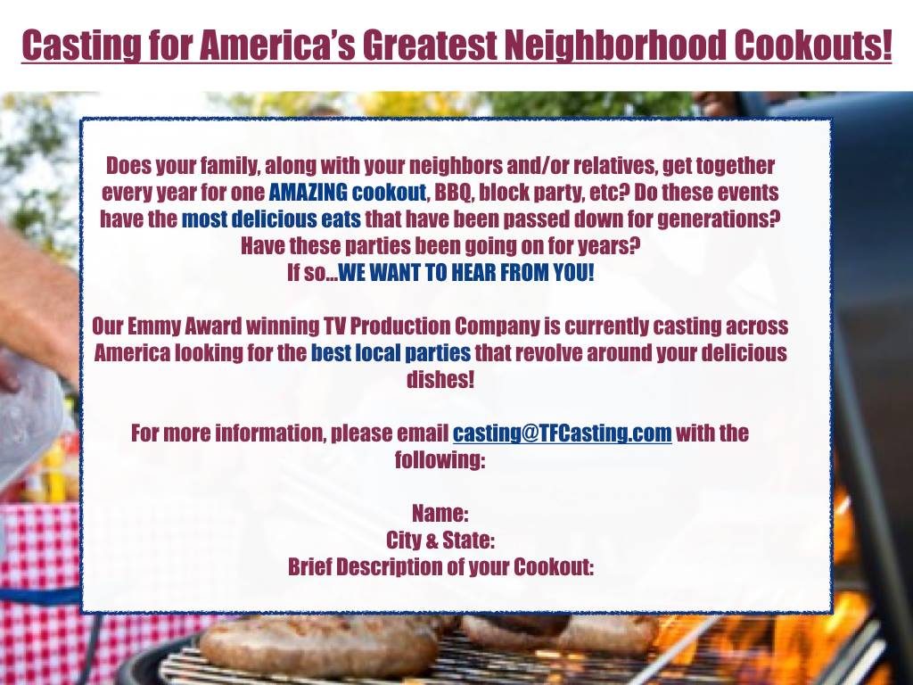 An award winning production company is searching for families, neighborhoods and friends that know how to throw an outdoor cookout.