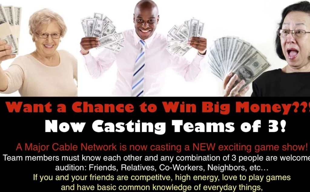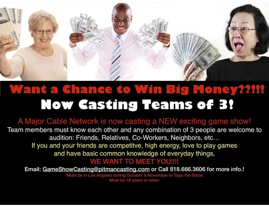 A Major Cable Network is now casting a NEW exciting game show! Team members must know each other and any combination of 3 people are welcome to audition: