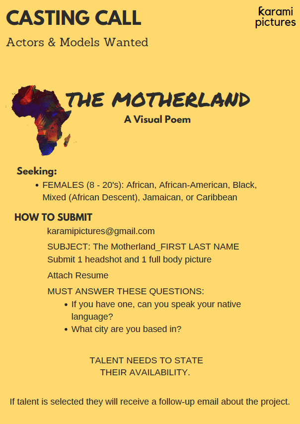 Talent needed for a visual poetry short film called the Motherland. This short film celebrates African culture, self-love, and body positivity.