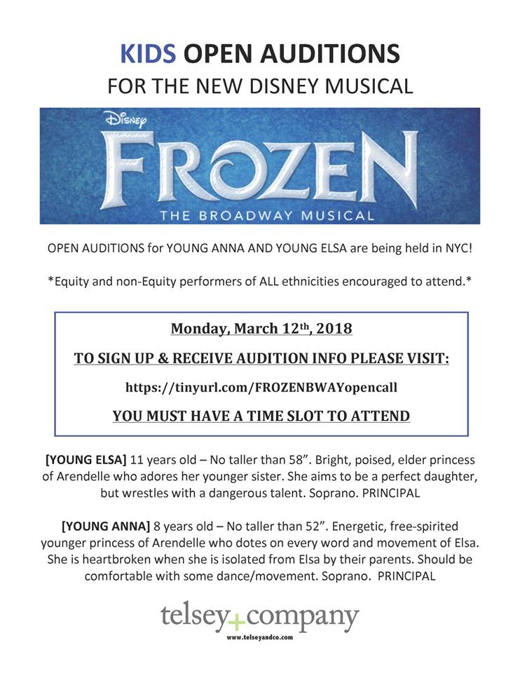 Disney casting directors are looking for 2 female, child singers / actresses to star in the “Frozen” musical show. The show is holding and invitational open call in the NYC area to fill 2 female, child roles that are able to play young versions of Elsa and Anna.