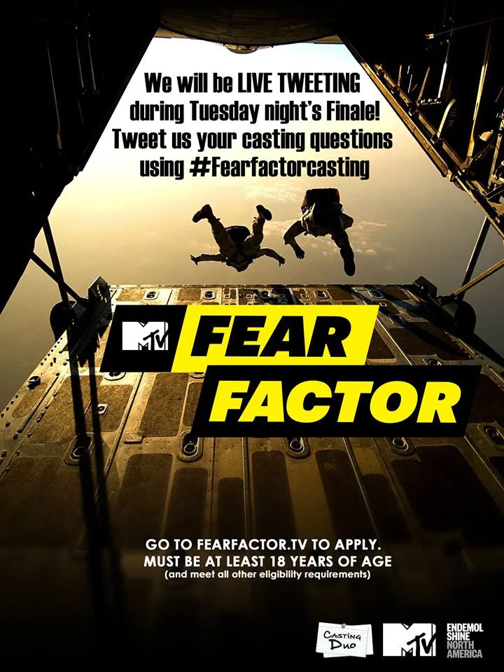 EndemolShine and Casting Duo are excited to announce the hit show FEAR FACTOR IS BACK! We are NOW CASTING teams of two to compete for up to $50,000! We are looking for adventurous, competitive teams who are ready for a chance to face their fears and compete! If you think you have the guts and determination to outpace your competitors
